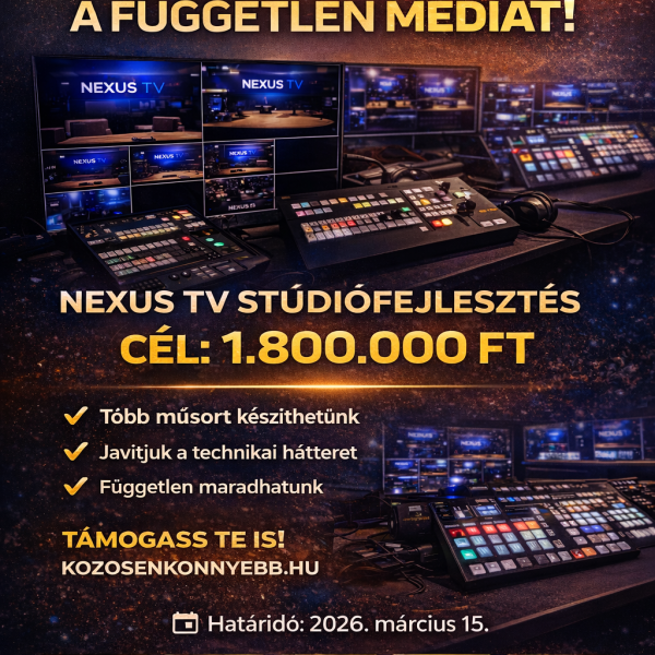 Segíts, hogy tovább működhessen a Nexus TV független közösségi műsorszolgáltatása! December 31-ig 500 000 Ft támogatást gyűjtünk a stúdió fenntartására, fejlesztésekre és új műsorok elindítására.